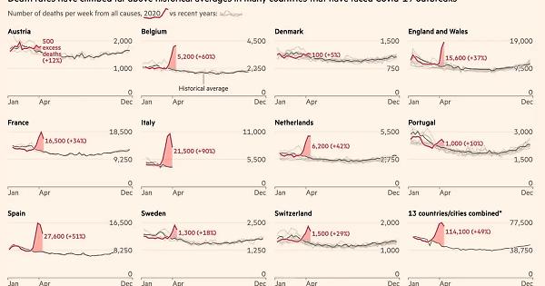 Le vittime del coronavirus nel mondo potrebbero essere molte di più, oltre il doppio, di quanto non dicano i dati ufficiali. E' quanto emerge da un'analisi del Financial Times condotta su 14 Paesi colpiti dalla pandemia, tra cui l'Italia e tutti i principali Paesi europei. Il quotidiano britannico parla di un bilancio delle vittime quasi il 60% superiore a quello delle statistiche ufficiali, un dato al quale gli esperti arrivano mettendo a confronto i decessi avvenuti tra marzo a aprile di quest'anno con quelli dello stesso periodo dei cinque anni passati. Risultato: ci sono stati 122 mila morti in più rispetto ai livelli normali, molti di più dei 77 mila decessi ufficiali registrati in queste nazioni a causa dei contagi del Covid-19. Se anche negli altri stati non compresi dallo studio del Financial Times i dati dovessero essere in egual misura sottostimati, il coronavirus globalmente potrebbe aver ucciso fino a 318.000 pazienti, ben al di sopra delle attuali 200.000 e oltre vittime. In tutti i Paesi analizzati, esclusa la Danimarca, il numero dei decessi da marzo ad aprile 2020 avrebbe di gran lunga superato la media storica: in Italia del 90%, in Belgio del 60%, in Spagna del 51%, nei Paesi Bassi del 42% e in Francia del 34%. In particolare, per quel che riguarda il nostro Paese il Financial Times calcola per la Lombardia, l'epicentro della pandemia in Europa, il 155% in più di decessi rispetto alla media dei cinque anni precedenti, e nella sola provincia di Bergamo del 464%, il dato più alto in assoluto davanti a New York (200%) e Madrid (161%).