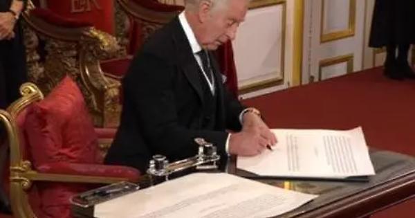 Re Carlo ha accettato di fronte all'Accsession Council l'atto di proclamazione che certifica la sua successione alla regina Elisabetta, firmando i documenti relativi, controfirmati a seguire da varie figure istituzionali inclusa la regina consorte Camilla