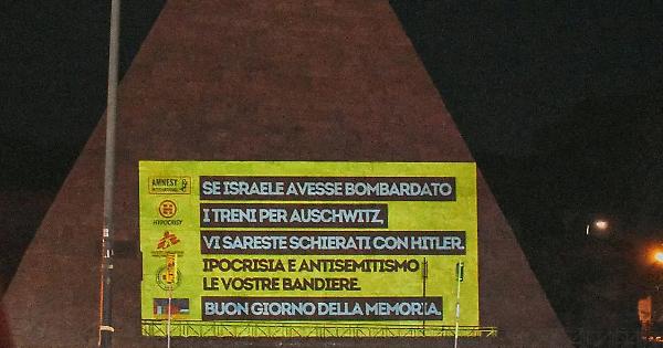 La stessa Associazione dei partigiani e organizzazioni come Amnesty, Emergency e la Croce Rossa sono finite nel mirino di una scritta proiettata nella notte sul Palazzo della Fao e sulla Piramide Cestia, a Roma: «Se Israele avesse bombardato i treni per Auschwitz vi sareste schierati con Hitler. Ipocrisia e antisemitismo sono le vostre bandiere», il testo del messaggio accanto ai vari loghi.