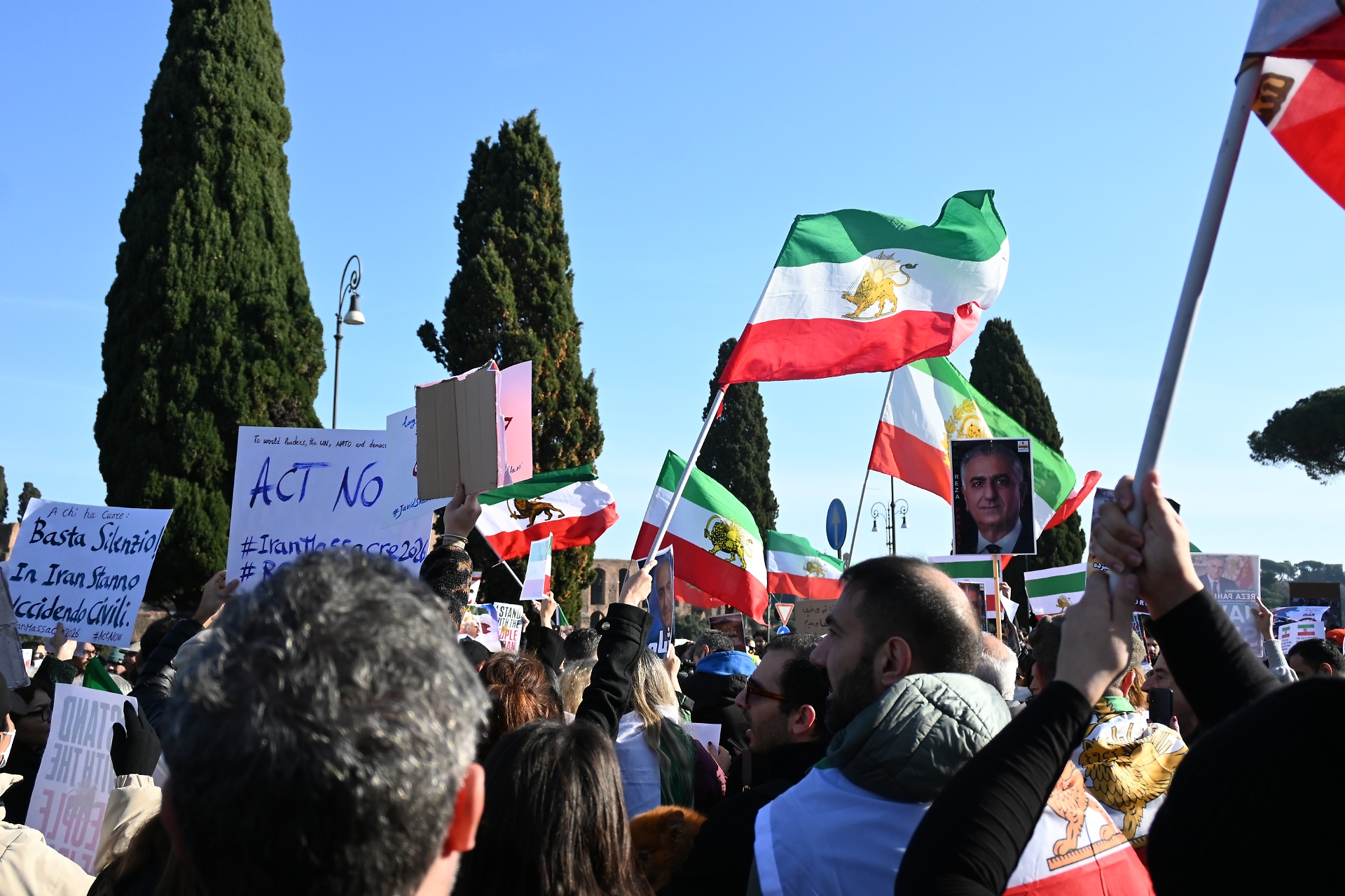 Il corteo parte e dal carro che lo guida vengono scanditi slogan come “Irgc terrorist” e Javid Shah, “viva lo Scià”, ripetuti a piena voce dalle persone in marcia. Molte le effigi del figlio dell’ultimo Scià, Reza Pahlavi, che pur non rappresentando l’intera opposizione iraniana è molto popolare tra i membri della diaspora, che in lui vedono una figura sotto la quale il popolo possa iniziare il processo di liberazione e democratizzazione della Persia. Si sono registrati anche brevi momenti di tensione tra sostenitori dello Scià e del movimento Donna, vita, libertà. Specchio di un’opposizione divisa perfino nelle piazze che fuori dall’Iran esprimono vicinanza e solidarietà al popolo iraniano. Anche l’opposizione italiana, però, fatica a trovare una voce comune di condanna su quanto sta accadendo in Iran. Quella di oggi è infatti la seconda manifestazione a sostegno del popolo iraniano in due giorni. Venerdì le principali forze d’opposizione si sono riunite in Campidoglio con l’effetto di indebolire, almeno numericamente, entrambe le iniziative. Un elemento che non passa inosservato è il gran numero di manifestanti a volto coperto per il timore di ripercussioni sulle famiglie che si trovano in Iran. «Abbiamo paura – spiega una manifestante – è rischioso per la nostra famiglia in Iran farci vedere a volto scoperto». Due ragazzi - uno porta uno scaldacollo tirato fino agli occhi, l’altro con solo un paio d’occhiali scuri a nascondere lo sguardo - con educazione evitano le domande: «Preferiamo non parlare, scusa».