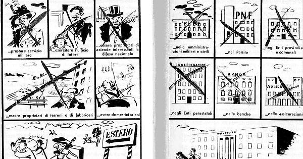 La legislazione antisemita comprendeva: il divieto di matrimonio tra italiani e ebrei, il divieto per gli ebrei di avere alle proprie dipendenze domestici di razza ariana, il divieto per tutte le pubbliche amministrazioni e per le società private di carattere pubblicistico – come banche e assicurazioni – di avere alle proprie dipendenze ebrei, il divieto di trasferirsi in Italia a ebrei stranieri, il divieto di svolgere la professione di notaio e di giornalista e forti limitazioni per tutte le cosiddette professioni intellettuali, il divieto di iscrizione dei ragazzi ebrei nelle scuole pubbliche, il divieto per le scuole medie di assumere come libri di testo opere alla cui redazione avesse partecipato in qualche modo un ebreo. Per tutti fu disposta l’annotazione dello stato di razza ebraica nei registri dello stato civile.