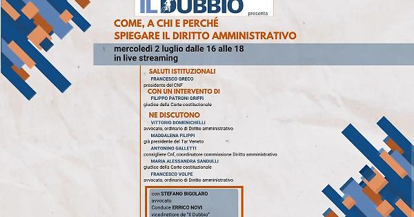 Un incontro on line per ricordare che il diritto amministrativo è parte integrante della nostra vita quotidiana e non dev’essere considerato “esoterico” o inaccessibile: lo trasmetterà domani pomeriggio, dalle 16 alle 18, il quotidiano “Il Dubbio” sulla propria pagina facebook e sugli altri profili social del giornale.
