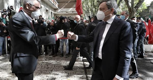 Il premier porta la solidarietà del governo alla Cgil dopo l'assalto di sabato alla sede del sindacato. Intanto partiti si scontrano sulla proposta di scioglimento di Forza Nuova, Meloni: «La sinistra vuole farci fuori»