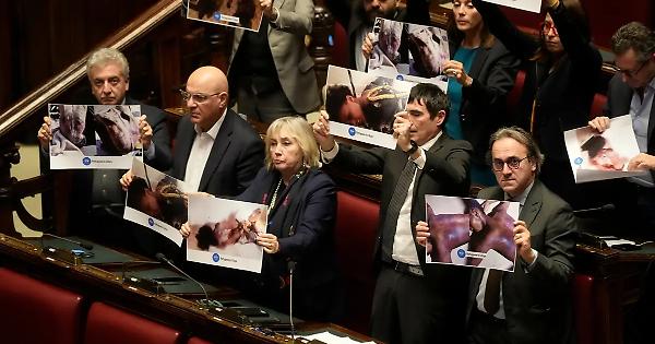Dal contenuto ben più duro i cartelli esposti dai parlamentari di Avs alla fine dell'intervento di Nicola Fratoianni, con le foto delle vittime di tortura nei centri libici, mentre il leader del M5s Giuseppe Conte ha concentrato il proprio attacco sull'assenza della premier e sulle critiche al procuratore Lo Voi operate dalla maggioranza: «Ormai siamo diventati un porto franco», ha detto, «un Paese dei balocchi dei criminali. Nordio è stato il giudice assolutore di Almasri», e ha avuto un atteggiamento scandaloso. Ha detto che si applica il Codice penale, e doveva dare seguito al provvedimento dell'Aja. Vergogna, vergogna, vergogna».